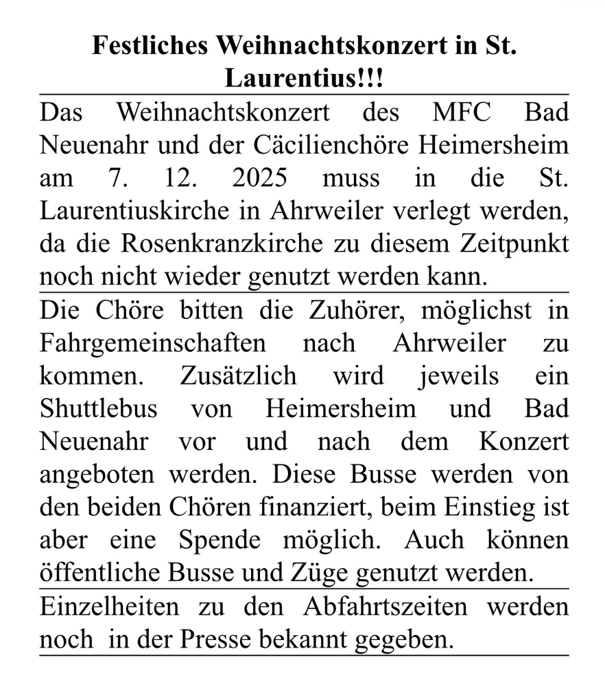 Der Kartenvorverkauf für das große Weihnachtskonzert des MFC Bad Neuenahrer Männer- und Frauenchor und der Cäcilienchöre Heimersheim ist gestartet.